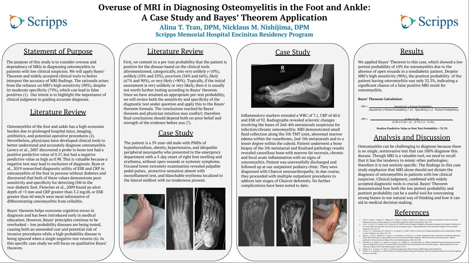 I presented a poster on the overuse of MRI in diagnosis osteomyelitis (bone infection) in the foot and ankle, applying Bayes’ Theorem to highlight the importance of clinical judgement. Too often, MRIs are ordered reflexively, despite the long standing research that depicts the combination of objective physical exam findings and lab studies can more accurately guide diagnosis. Imaging studies may be highly sensitive in revealing abnormalities, but it cannot reliably distinguish between the various differential diagnoses such as infection or inflammatory pathologies. My goal with this presentation was to remind the medical community that while technology is valuable, it should complement — not replace — thoughtful reasoning.